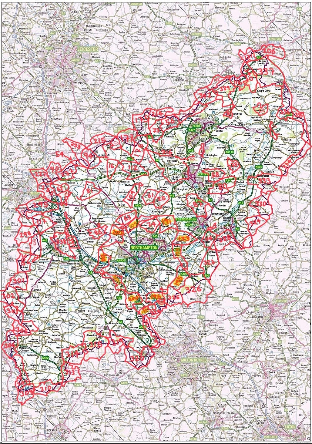 Northamptonshire borders eight other counties (depending how you count, the joint most of any English county): Leicestershire, Warwickshire, Oxfordshire, Buckinghamshire, Bedfordshire, Cambridgeshire, Lincolnshire and Rutland. The border with Lincolnshire, south-west of Stamford, is the shortest county border in the country, at only about 19 metres long3.